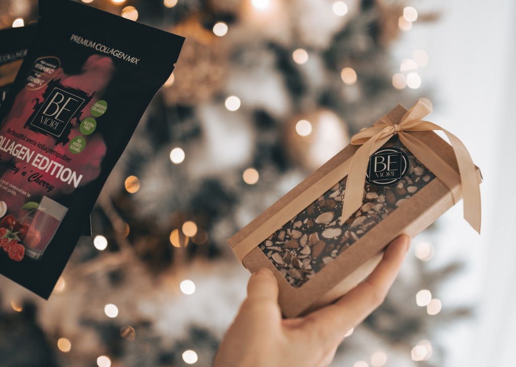 Eriti hea uudis magusasõpradele, kes tahavad hoida samal ajal tervislikku joont – patuvaba maiustaja kombo sisaldab käsitöö šokolaadi, mis on orgaaniline, ilma lisatud valge suhkruta, laktoosi- ja gluteenivaba ning 100% naturaalne. Kombole saad kaasa veel ka ühe Be More kollageenisegu – saad ise valida, kas soovid Buckthorn’n’Lemon või Rasperry’n’Cherry maitselist.