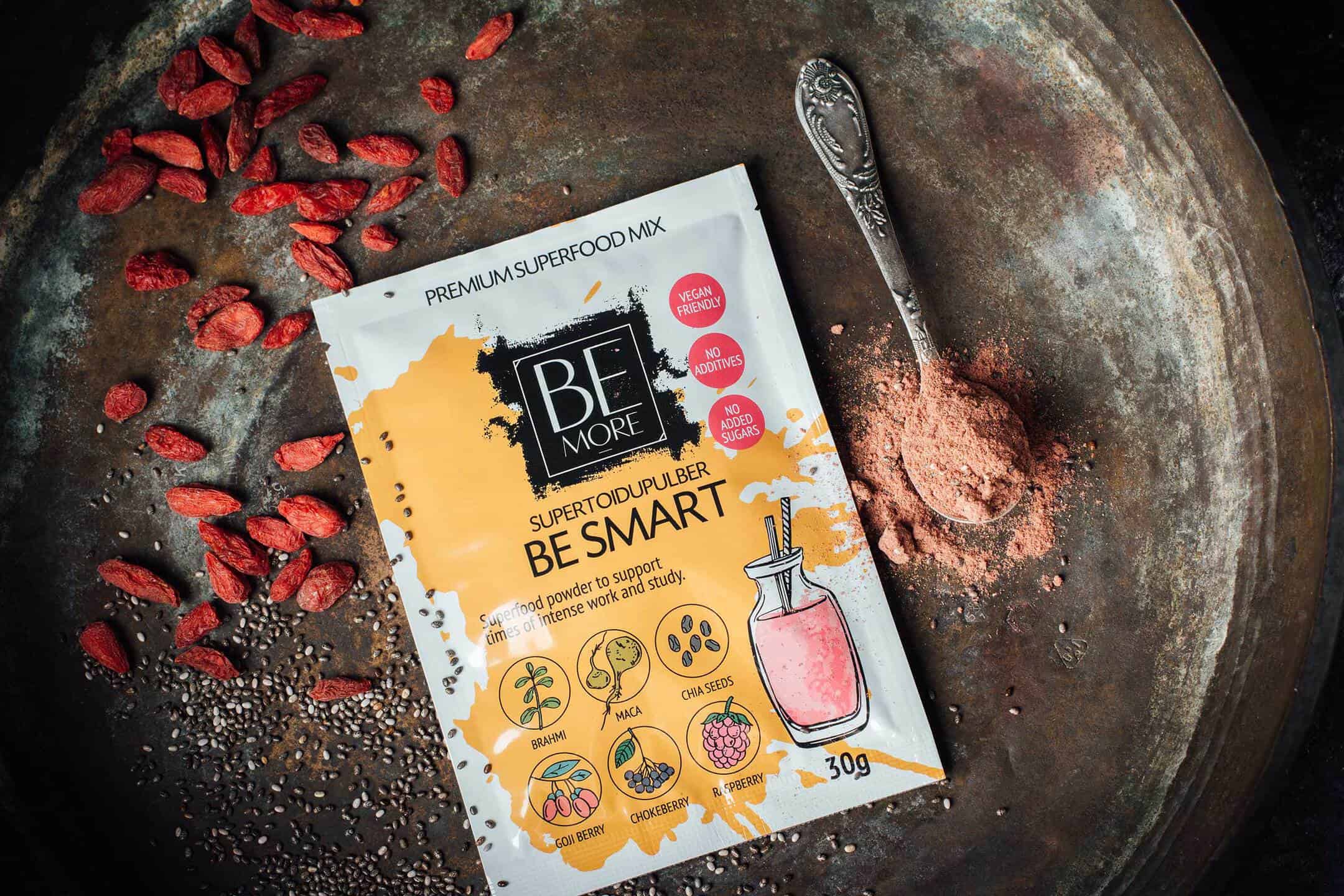 Sellesse tootesse on kokku pandud kuus erinevat supertoiduainet, et aidata sul koolis ja tööl edukalt hakkama saada. Be Smart sisaldab Indiast pärit taime brahmi, mida kohalikud kasutavad mälu ja keskendumise toetamiseks. Eestis on musta arooniat kasvatatud juba aastasadu ning huvi antud taime vastu on suur tänu selle antioksüdantide sisaldusele. Aroonia sisaldab C-vitamiini, mis aitab kaasa normaalsetele psühholoogistele funktsioonidele.