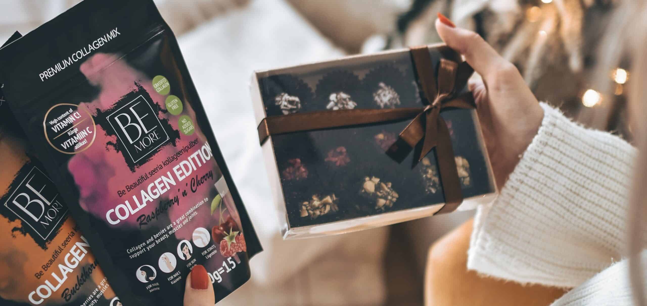 Although I like to experiment with different flavors, in this candy box you will find nice berry-fruity flavors. The raspberry-coconut-filled candy with Raspberry’n’Cherry collagen blend is delicate, but at the same time kind of flavor explosion, the blackcurrant-nut candy with Be Active superfood blend has a slightly fuller taste, with kind of a freshness note and the chocolate-orange candy with Buckthorn’n’Lemon collagen blend has a very delicious and luxurious taste.
