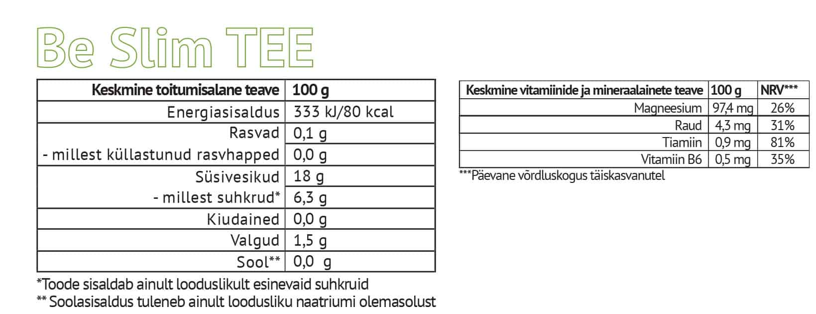 Be Slim tea is a combination of Yerba mate and lemongrass. Yerba mate is made from the dried leaves of  Ilex paraguariensis – a native plant of South America and that’s gaining worldwide popularity because of the way it improves how people feel.  It’s said that it has the strength of coffee, health benefits of tea, and the joy of chocolate. Lemongrass has strong and pleasant flavour and taste which is very similar of lemons’. Lemongrass is known for improving metabolism.