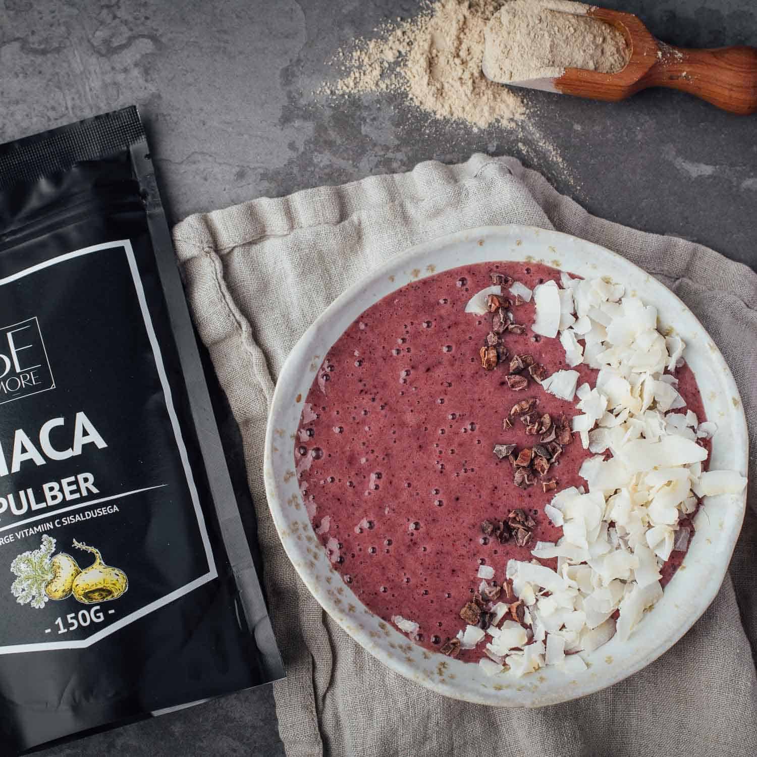 Maca juure pulbrit on kerge sobitada oma igapäevamenüüsse – see sobib smuutidesse, pudrule, küpsetistesse, hommikuhelvestele, energiabatoonidesse jne.