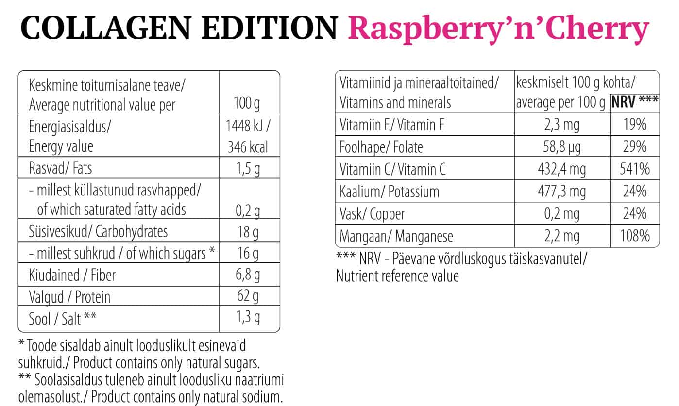 COLLAGEN EDITION Raspberry’n’Cherry on suurepärane kollageeni allikas. See ilusegu toetab sinu keha loomulikku kollageeni moodustamise protsessi, sisaldades lisaks hüdrolüüsitud kollageenile veel C-vitamiini, mangaani, foolhapet ja vaske. Segus sisalduv kaalium toetab sinu närvisüsteemi. E-vitamiin toimib antioksüdandina, toetades naha loomulikku ilu.