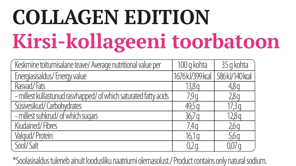 Collagen Edition kirsi-kollageeni toorbatooni koostisosad: datlid, gluteenivaba kaerajahu, agaavisiirup, Be More Collagen Edition Rasperry’n’Cherry kollageenipulber (13%) (hüdrolüüsitud veisekollageen, külmkuivatatud vaarika pulber, külmkuivatatud kirsi pulber, külmkuivatatud camu-camu pulber, külmkuivatatud sidruni pulber), INDIA PÄHKEL, külmpressitud kookosõli, külmkuivatatud kirsi tükid (6%), hüdrolüüsitud kollageeni pulber (3%), külmkuivatatud vaarika tükid (1%).