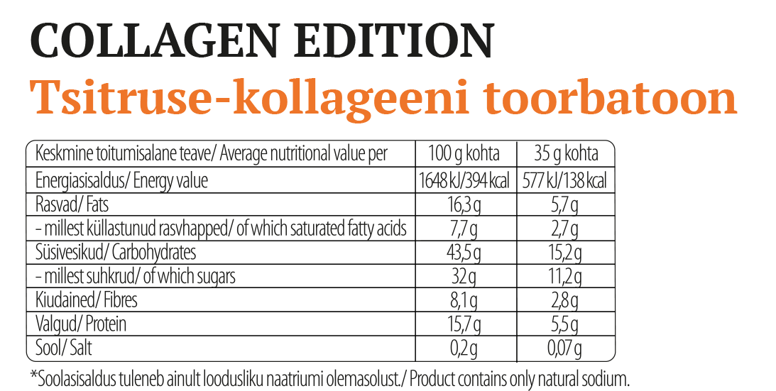 Collagen Edition tsitruse-kollageeni toorbatooni koostisosad: datlid, gluteenivaba kaerajahu, agaavisiirup, Be More Collagen Edition Buckthorn’n’Lemon kollageenipulber (12%) (hüdrolüüsitud veisekollageen, külmkuivatatud astelpaju pulber, külmkuivatatud sidruni pulber, külmkuivatatud camu-camu pulber, külmkuivatatud karusmarja pulber), MANDLIJAHU, külmpressitud kookosõli, külmkuivatatud apelsini tükid (5%), SARAPUUPÄHKLID, hüdrolüüsitud kollageenipulber (2%), külmkuivatatud sidrunipüree pulber (0,5%).