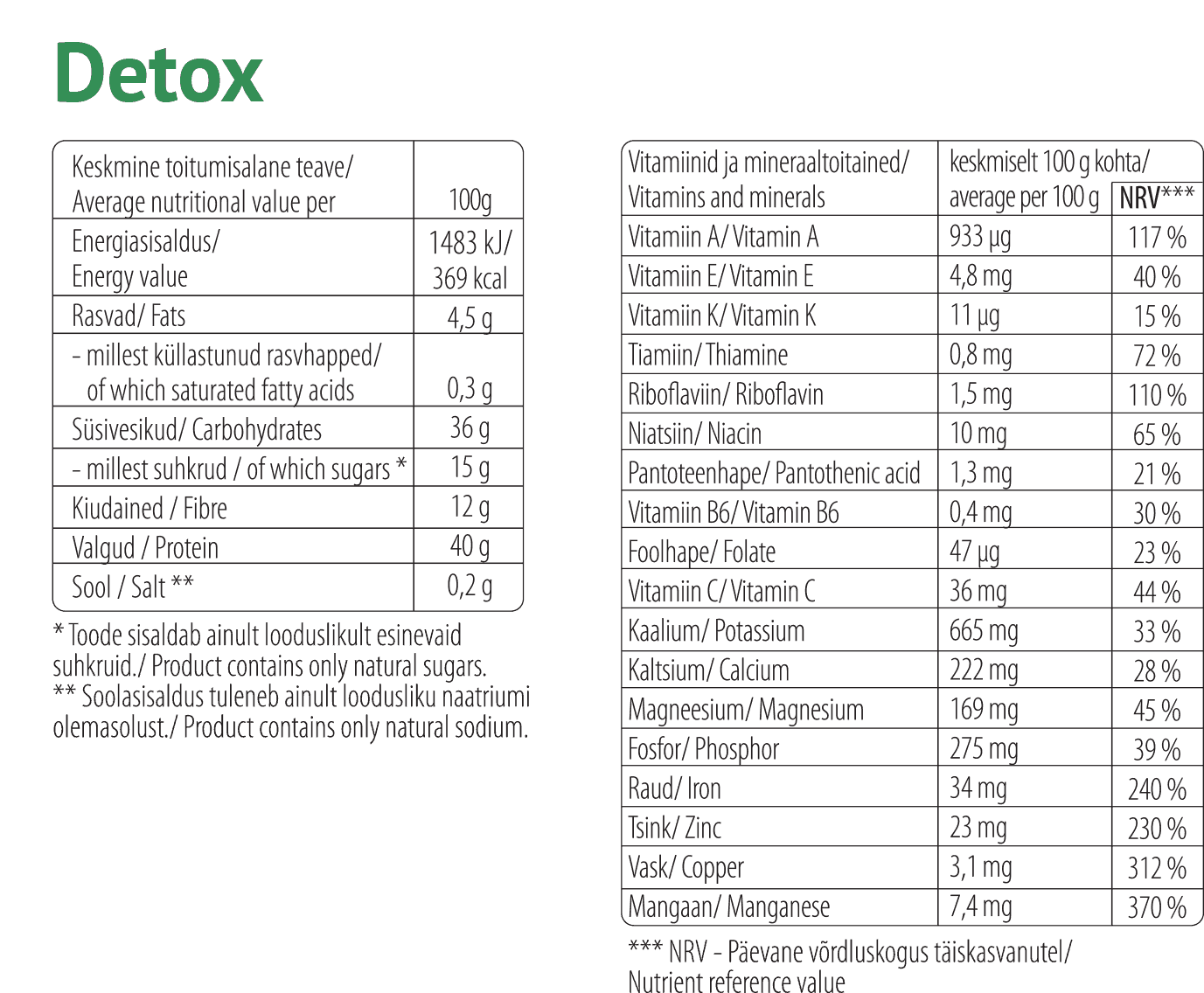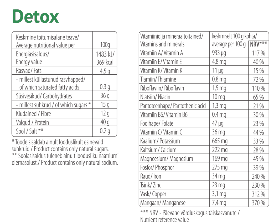 Detox segu koostisosad: külmkuivatatud pohlapulber (20%), herne proteiinipulber (19%), klorella (18%), spirulina (16%), nisuoras (12%), sidrunhein (10%), külmkuivatatud jõhvikapulber (5%).