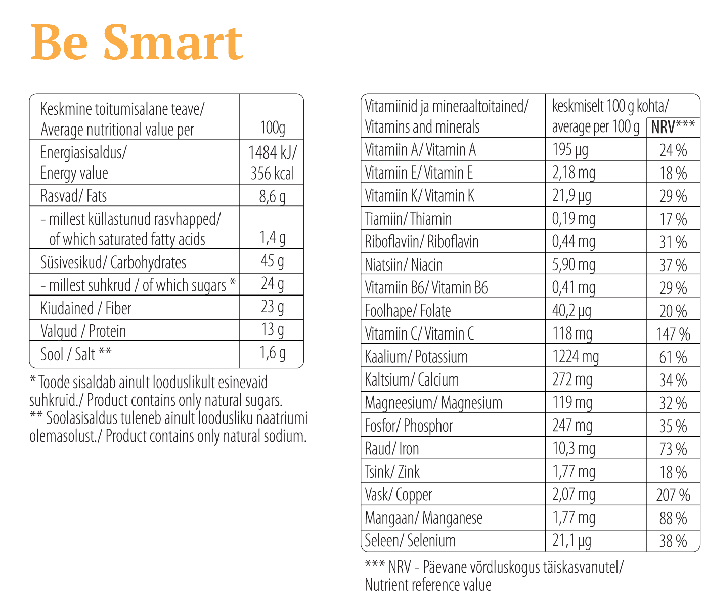 Be Healthy supertoidusegu: Külmkuivatatud mustsõstra pulber (54%), chaga pulber (18%), chia (Salvia hispanica) seemne pulber (9%), külmkuivatatud maapirni pulber (9%), külmkuivatatud camu-camu pulber (6%), külmkuivatatud sidruni pulber (4%).