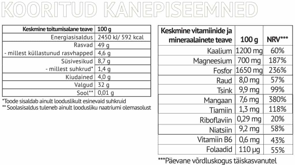 1-3tl segatuna smuuti, pudrule või salatile. Kanepiseemned on toitvaks lisandiks toidu valmistamisel.