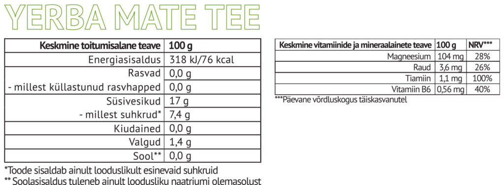 Paljude vitamiinide ja mineraalidega rikastatud tee annab energiat, parandab keskendumisvõimet, kiirendab ainevahetust, põletab rasvu, vähendab söögiisu ja aitab kaasa seedimisele.