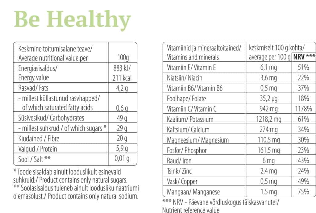 Be Healthy supertoidusegu: külmkuivatatud mustsõstra pulber (54%), chaga pulber (18%), chia (Salvia hispanica) seemne pulber (9%), külmkuivatatud maapirni pulber (9%), külmkuivatatud camu-camu pulber (6%), külmkuivatatud sidruni pulber (4%).