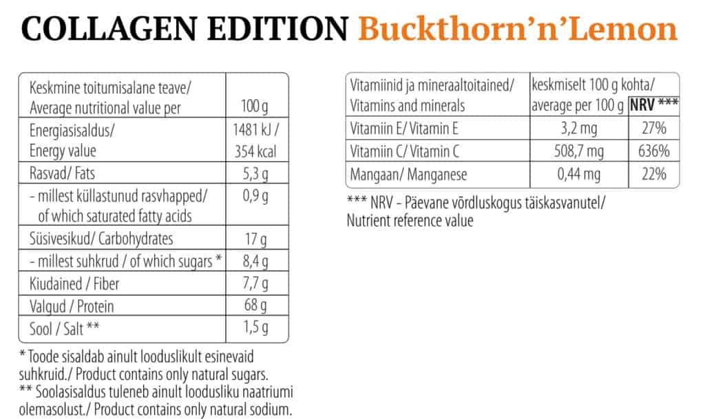 COLLAGEN EDITION Buckthorn’n’Lemon: hüdrolüüsitud kollageen (74%), külmkuivatatud astelpaju pulber (15%), külmkuivatatud sidruni pulber (4%), külmkuivatatud camu-camu pulber, külmkuivatatud karusmarja pulber.
