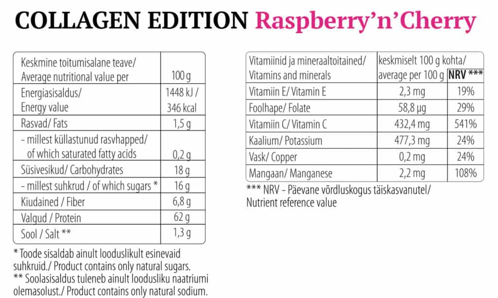 COLLAGEN EDITION Raspberry’n’Cherry: hüdrolüüsitud kollageen (66%), külmkuivatatud vaarika pulber (20%), külmkuivatatud kirsi pulber (7%), külmkuivatatud camu-camu pulber, külmkuivatatud sidruni pulber.